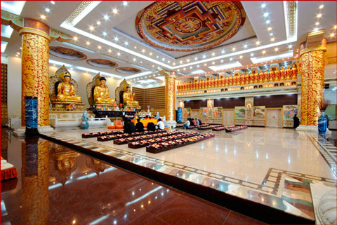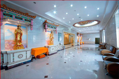 金寶塔共九層,通高52.6米,高聳入云,氣勢巍峨。取法于中國古代建筑之宏偉壯麗,塔剎的重檐琉璃瓦金碧輝煌,與藍天白云相映生輝,秉承“天人合一”的傳統(tǒng)文化,呈現(xiàn)“天宮勝殿”的建筑之美。