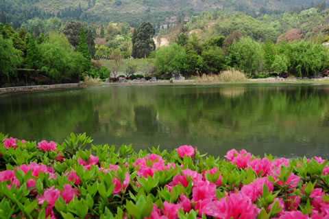 岱色山峰連綿一片,山腳是平靜的湖水,倒映著絢爛的落日。沒有一絲波紋的平靜湖水,映照著在藍天中緩緩流動的白云,宛如一幅淡雅的水墨國畫圖。待到秋來,金黃的樹影與由淺及深的綠色交錯,在天光的映射下倒映池中,繪出一幅讓人贊嘆不已的大自然杰作。