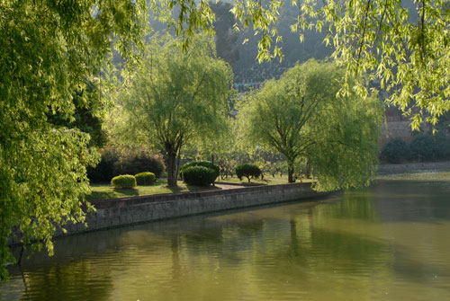 福園位于安樂園下段,背承龍脈,前望龜山,北側(cè)是潛龍福地廣場(chǎng),南側(cè)與藝術(shù)名人苑相望,窩風(fēng)藏水,福澤瑞祥。福園前方,環(huán)繞放生池的一泓清水,奇石扶岸,綠柳婆娑,由此形成的桃園觀瀑景區(qū),為游人提供了一個(gè)清靜的休憩之地。石上飛瀑濺玉,池中魚游龜戲,風(fēng)動(dòng)花影、桃李報(bào)春,足以讓人細(xì)細(xì)觀賞品味。