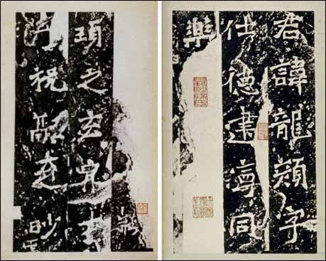 《爨龍顏碑》立于南朝宋大明二年(四五八),比《爨寶子碑》晚五十三年。可以說這兩塊碑是同時代的作品。它的結(jié)體以方整為主,但轉(zhuǎn)折處已使用圓轉(zhuǎn)筆法,而不像《爨寶子碑》那樣如矩形的折角,更具有楷書的特征。我們可以從《爨龍顏碑》筆畫的圓潤剛強(qiáng),窺見其運(yùn)筆實(shí)源于篆法,起筆雖有方圓之分,但筆劃均極為厚重!鹅帻堫伇吩谑址ㄉ细┭鲆咀專杳芟嚅g,在結(jié)構(gòu)上姿態(tài)奇逸,舒斂自如?涤袨樵u說:“下畫如昆刀刻玉,但見渾美;布勢如精工畫人,各有意度,當(dāng)為隸楷極則。”
