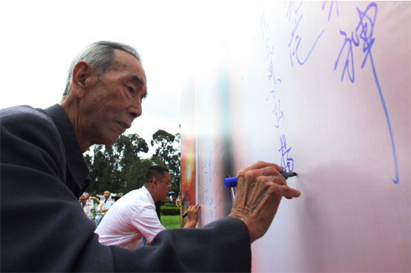 金寶山特別邀請春城晚報副總編輯、我省著名詩人嘉費擔任《英雄墻上的紅色人生》編委會主任。在書籍啟動儀式上發(fā)表了熱情洋溢的講話,他說:“今天,來到金寶山軍魂園參加《英雄墻上的紅色人生》書籍啟動儀式,我倍感榮幸。看到金寶山軍魂園這樣一個龐大的精神寶庫,能夠近距離感受到革命先輩留下來的紅色文化,似乎歷史就歷歷在目;再者,看到了來參加活動的革命老前輩,他們風采仍舊、身體健朗,向人們講述著那個激情燃燒的紅色歲月,這種感動就在眼前,也深植于我們的心間。我們要穿過歷史,回到那個戰(zhàn)火硝煙的年代,解讀英雄們那些偉岸的背影,參與到每一個人、每一件事的歷史回眸,為每一個革命先輩的紅色人生寫下光彩的一筆,在書寫中傾注著我們的崇敬,并圓滿地完成《英雄墻上的紅色人生》這本書籍的編輯工作。”關于此書的意義,費嘉表示,書籍的意義就意味著永恒,通過文字的傳承,那些歷史的記憶是經久不衰的。我們把這種值得珍藏和傳承的回憶寫進書里,讓書籍成為傳遞英雄紅色文化的載體,為時代留下英雄的足跡和人生解讀,這無疑是一件十分有意義的事情,而且也是精神文明建設的組成部分。之后,他在背景墻上留下了“英雄不朽、偉業(yè)長存。”的感言。