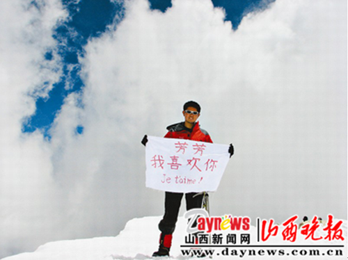 為購買東西方便,老張頭上網(wǎng)尋找翻譯,在網(wǎng)上,他邂逅了芳芳――河北秦皇島某大學法語系學生。以后,從相識到相戀,兩人感情不斷升溫。“我在這個地方住幾天,又得趕往別的地方參加活動,這么多年,芳芳始終沒有明確答應做我的愛人。所以,我決定,將我對她愛的誓言帶在身邊,送到我登過的每一個雪山之巔,直至她明確答應。”老張頭說。